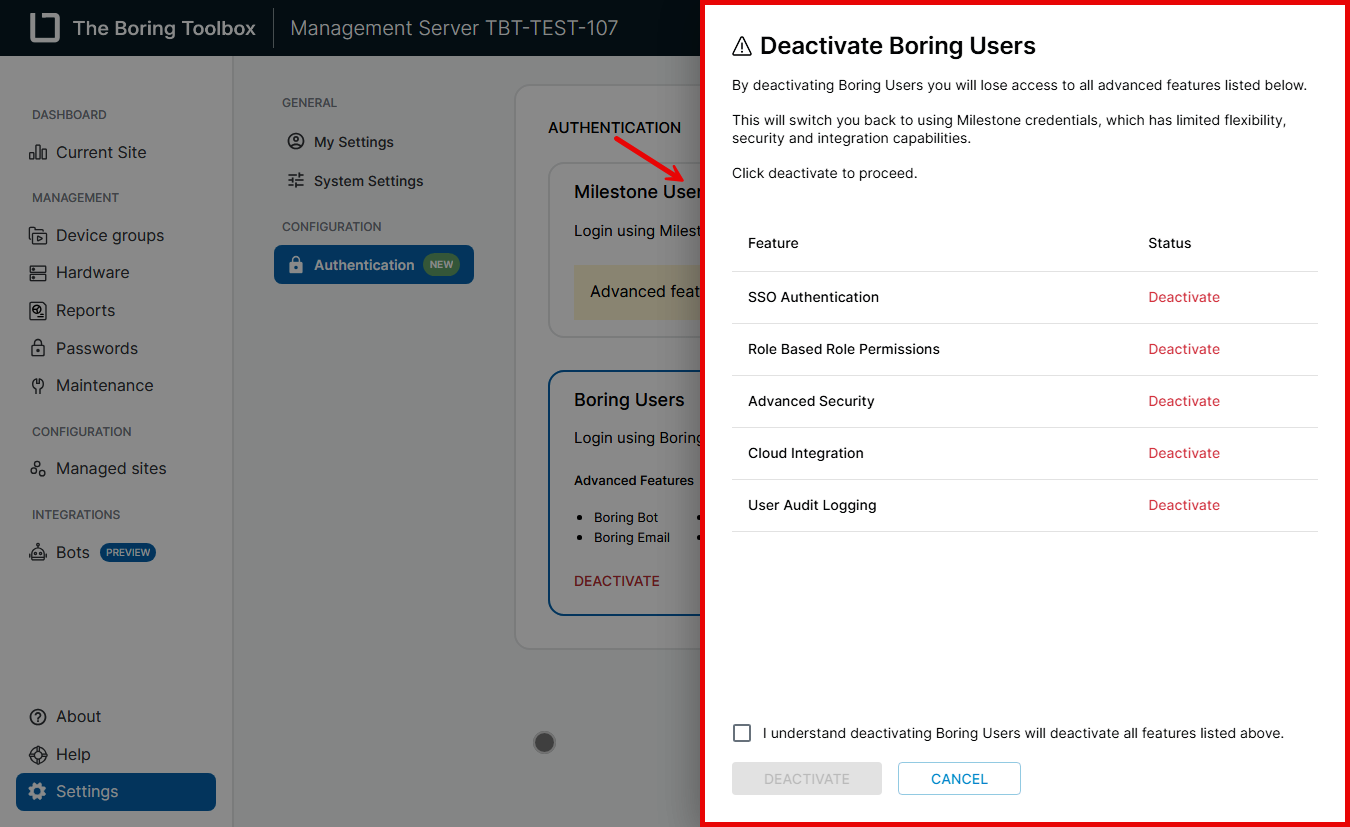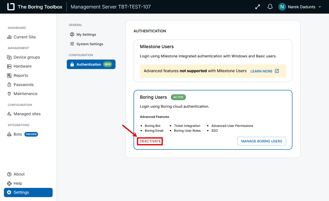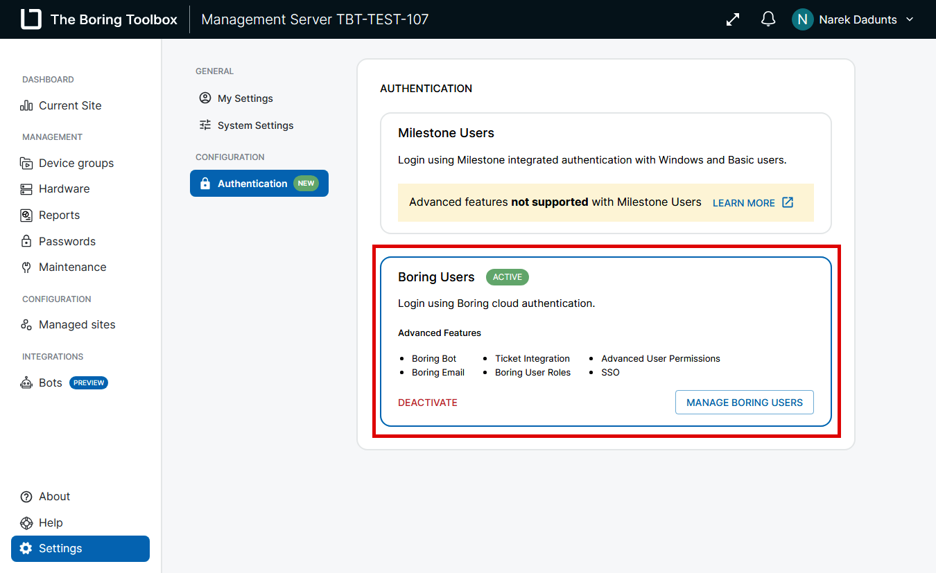 In the Boring Toolbox, you can toggle between using Boring Users (local authentication) and Milestone Users (authentication via Milestone XProtect). If you no longer want to use Boring Users and prefer to manage authentication through Milestone, follow the steps below to deactivate Boring Users. This process ensures that only Milestone-based authentication is enabled and active for your site.