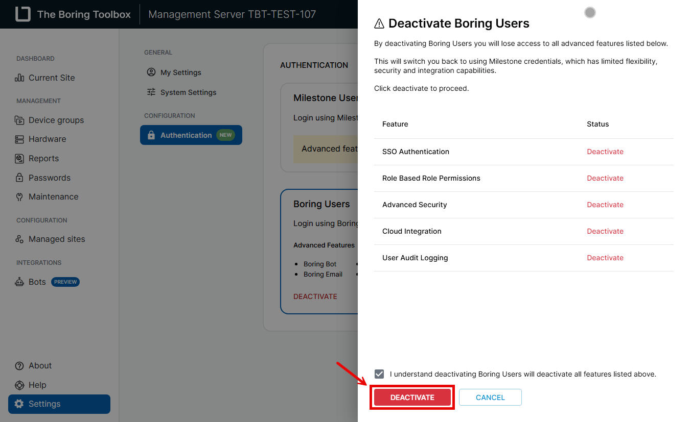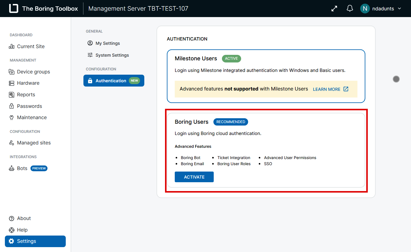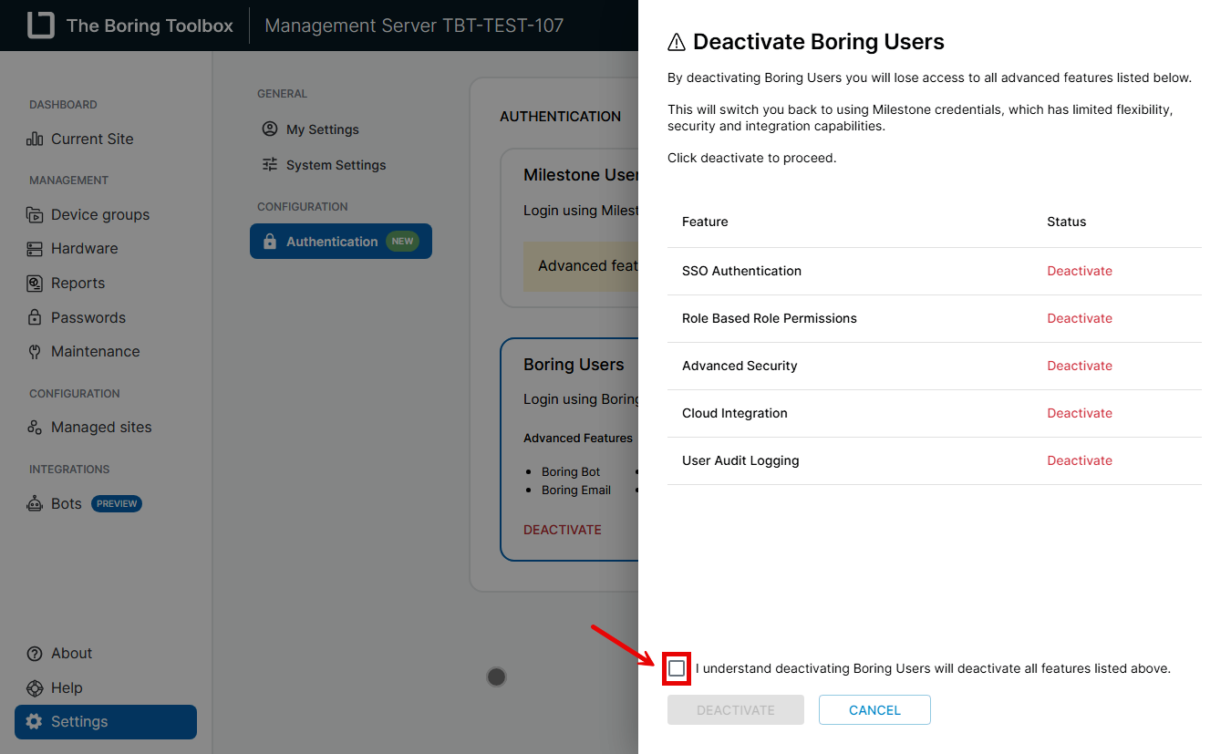 In the Boring Toolbox, you can toggle between using Boring Users (local authentication) and Milestone Users (authentication via Milestone XProtect). If you no longer want to use Boring Users and prefer to manage authentication through Milestone, follow the steps below to deactivate Boring Users. This process ensures that only Milestone-based authentication is enabled and active for your site.