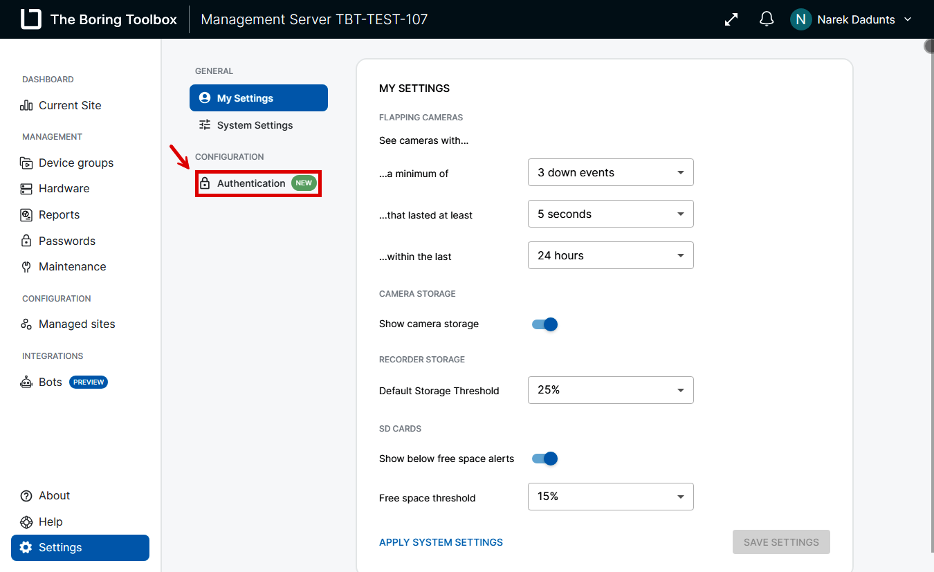 3. Open the Authentication Settings